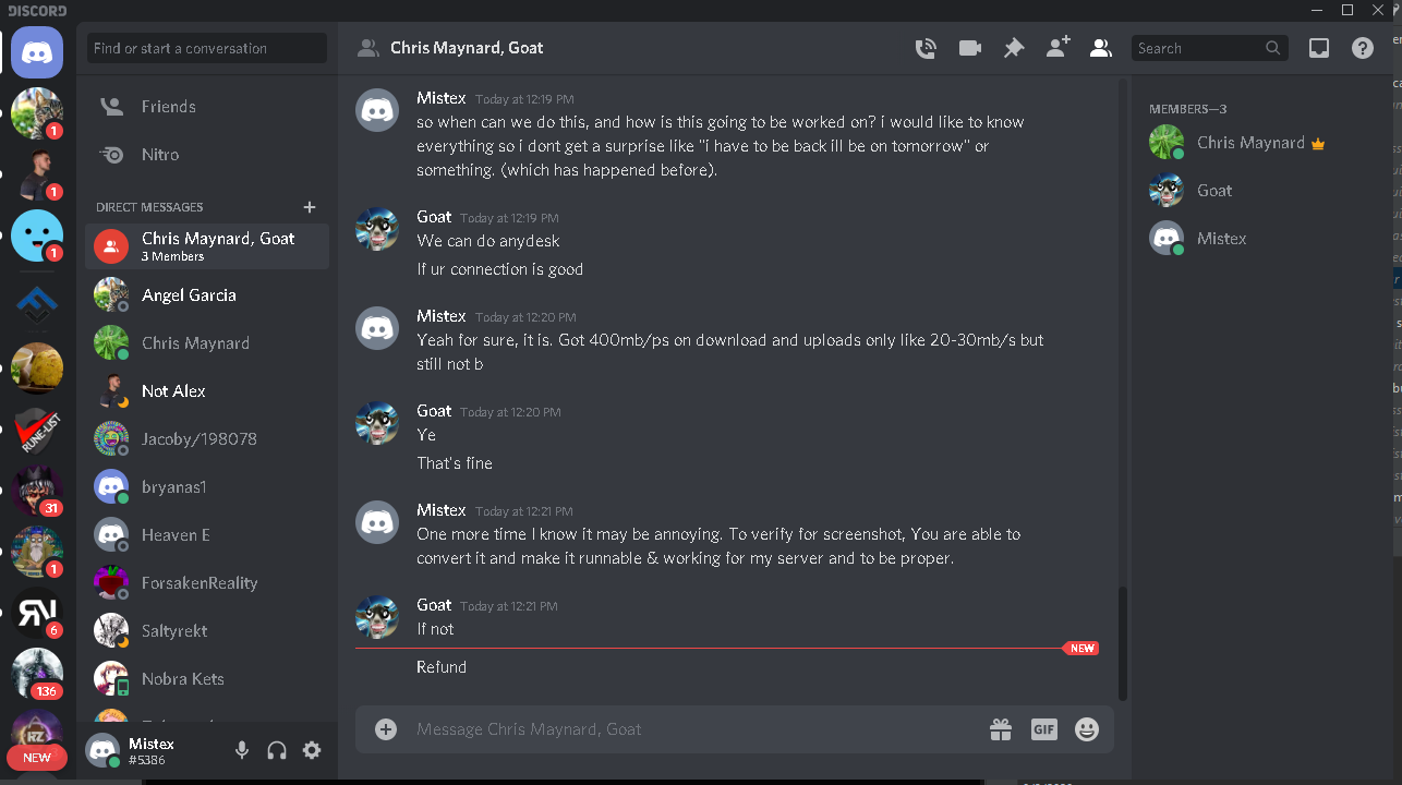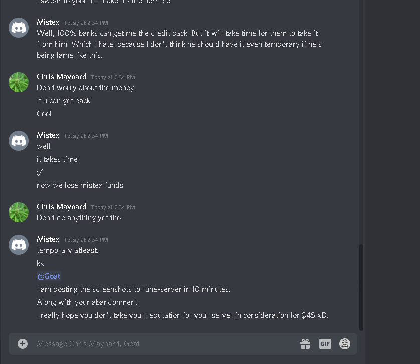 He has left the scene of this chat, and promised me to connect for 2 hours now. He connected, looked at what I told him to code then disconnected. Deletes us off discord, as well as Bans my buddy off his server who told me to go through him for services.