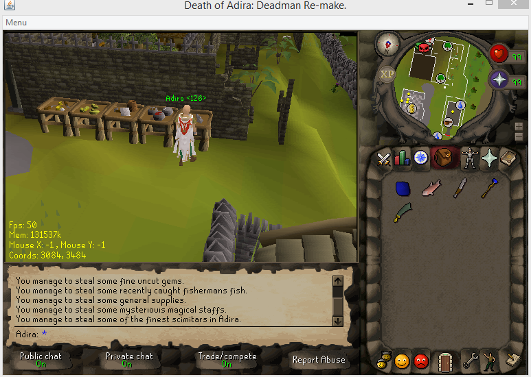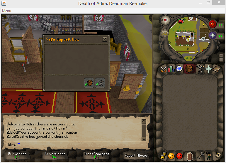 Code:November 11th, 2015: - Recieved sprites #95/96 - Packed cache with new sprites - Added 'Safe Deposit Box' interface. November 12th, 2015: - Changed gameframe to 459 - Started server-side clipping. November 13th, 2015: - Adding escape routes / mini-quests to escape from enemies. - Thieving Stalls - When thieving they will award you with items to help you progress further inside the game. - Seperate stall for money, however... it's in a risky zone!